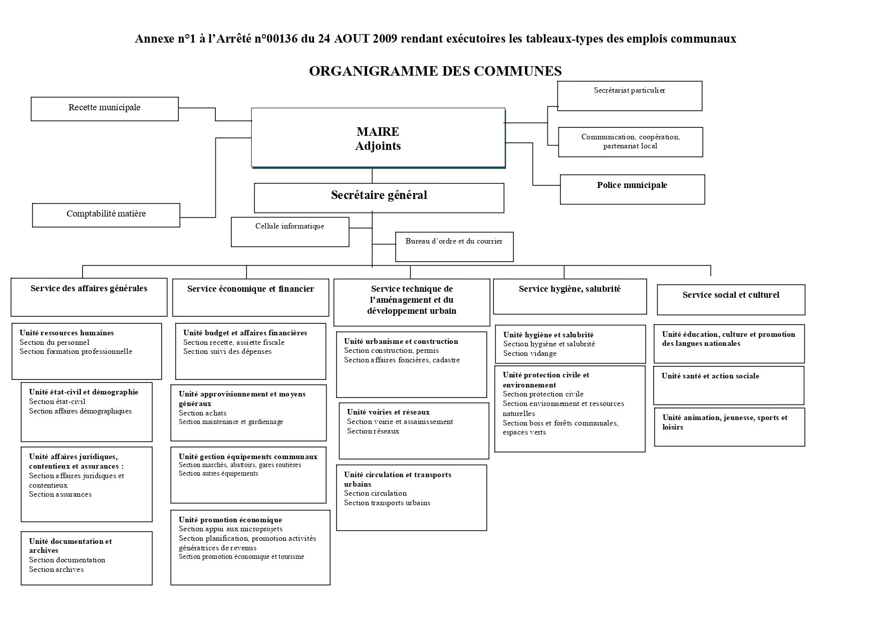 L’organigramme fonctionnel de la commune montre certaines limites comparées à l’organigramme type des communes. Les services directement rattachés au Maire incluent le Secrétariat Particulier et plusieurs unités :